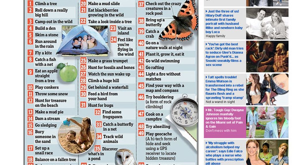 En los diez primeros puestos se encuentran 1. Subir a un árbol; 2. Rodar hacia abajo en una gran colina; 3. Acampar con viento; 4. Construir un foso; 5. Descamar una piedra; 6. Correr bajo la lluvia; 7. Volar una cometa; 8. Coger un pez con una red; 9. Comer una manzana cogida de un árbol; 10. Jugar a conquistadores. A estos básicos le siguen tirarse bolas de nieve, buscar un tesoro en una playa, hacer un pastel de barro, montar en trineo, enterrar a alguien bajo la arena, montar una carrera de caracoles, columpiarse en un árbol caído, balancearse en un columpio o deslizarse en el barro.