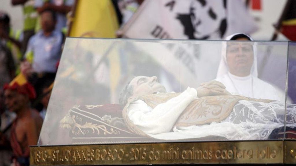 Cientos de fieles católicos contemplan el pase del féretro de San Juan Bosco por las calles de Dili, en Timor Oriental, viernes 18 de febrero de 2011. San Juan Bosco fue canonizado en 1934 y es considerado por la iglesia católica patrón de los jóvenes. EFE