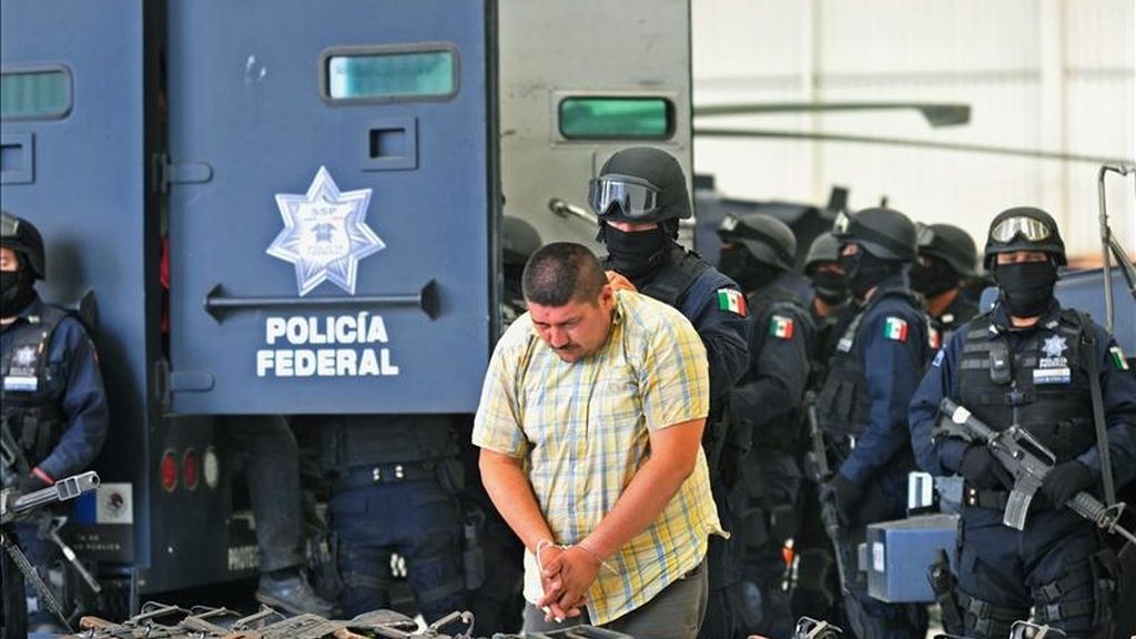 La Policía Federal mexicana muestra hoy en Ciudad de México a uno de los 36 integrantes del cartel narcotraficante de La Familia, detenidos tras un operativo en el que once de sus sicarios resultaron muertos en los límites de los estados de Michoacán y Jalisco, oeste de México, según informó en la fecha la Secretaría de Seguridad Pública (SSP) federal. EFE