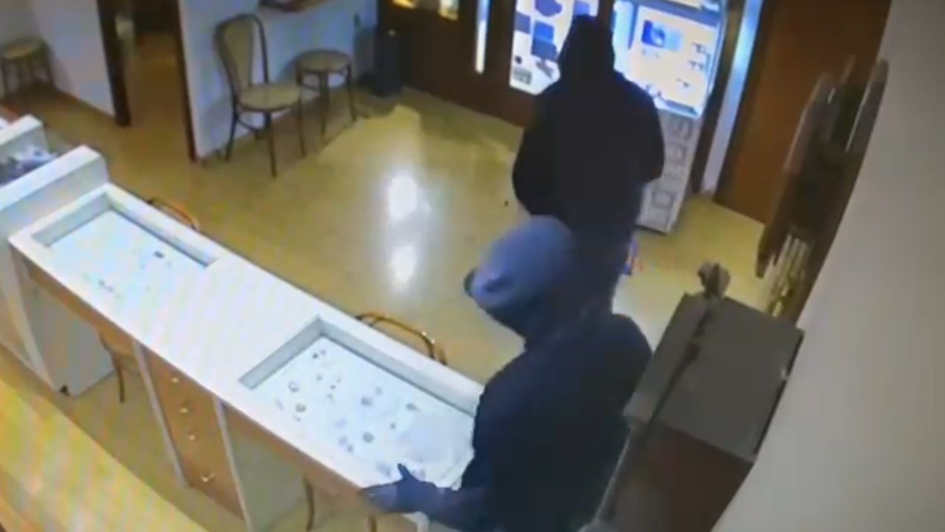 Al ver a los asaltantes, la dependienta corre para apretar el botón de alarma pero la interceptan y la obligan a abrir la caja fuerte repitiéndole varias veces "Dame el dinero". Mientras uno la mantiene retenida en el suelo, el otro ladrón coge el dinero y las joyas, algunas de clientes que las habían dejado para reparar. Según el dueño de la joyería, pudieron llevarse un botín de 150.000 euros, calculando solo el precio de coste del material y no el de venta al público. Los dos hombres consiguieron huir usando un patinete.
