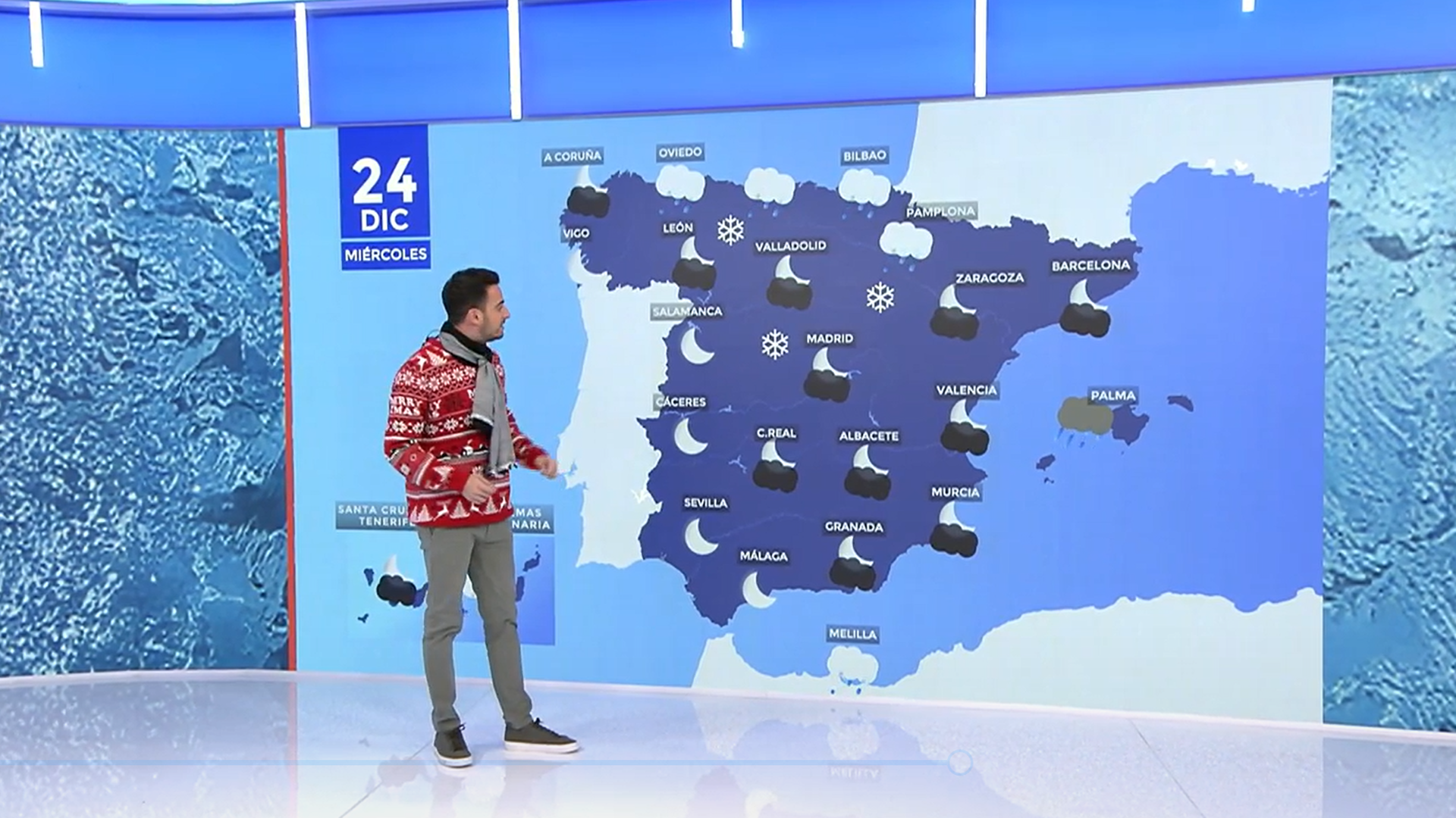 Para los días festivos, el día de Nochebuena y Navidad, poco a poco la estabilidad será imponiendo con excepciones, como en el cantábrico, donde la noche será lluviosa. También en Baleares, donde pueden ser fuertes, y en Canarias, de carácter más leve. Por lo general, la estabilidad se irá imponiendo en mayor parte del país, con un tiempo más tranquilo para Nochebuena, incluso con una pequeña subida de temperaturas, poca duradera, porque después desde Rusia volverá a llegar una masa de aire muy fría.