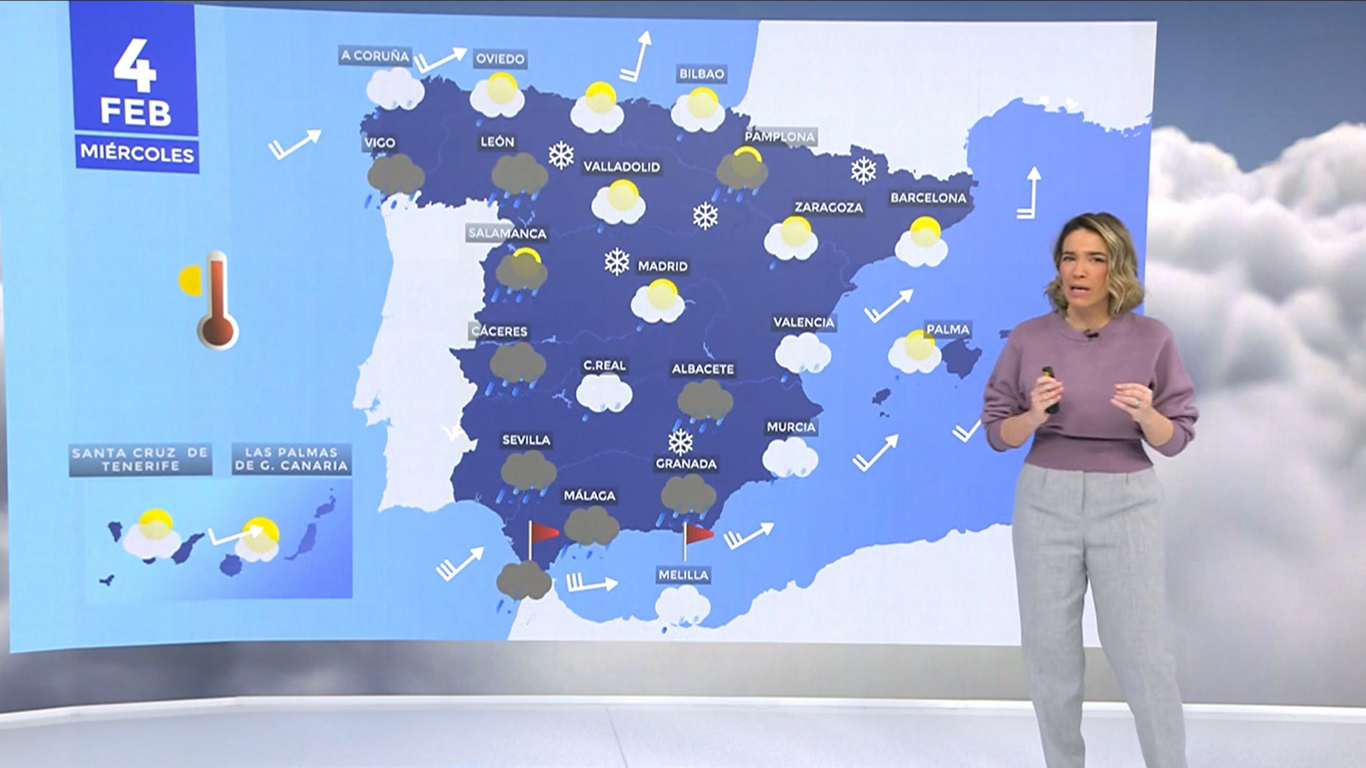 Se verán chubascos débiles en el centro y en el Cantábrico más oriental, produciéndose nevadas tan solo en todas las zonas de montaña, tanto sudeste, en el interior y en el tercio norte, situándose la cota de nieve en torno a los 900-1000 metros.