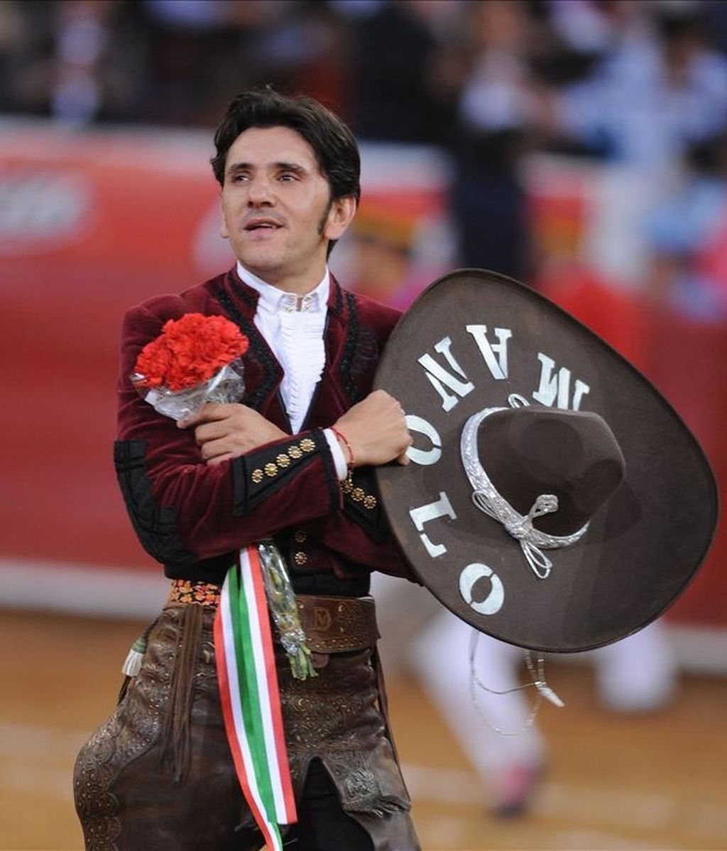 El rejoneador español Diego Ventura celebra tras cortar dos orejas el 7 de febrero de 2011, en la capital mexicana, durante la corrida para festejar el 65 aniversario de la inauguración de la Monumental Plaza México. EFE/Archivo