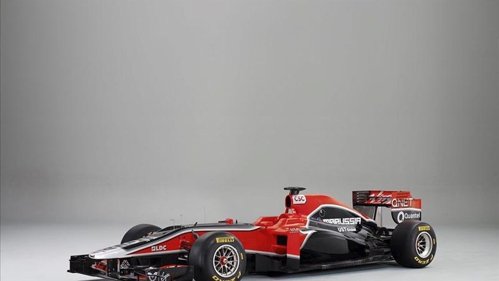 Fotografía facilitada por Marussia Virgin Racing hoy, lunes, 7 de febrero de 2011 que muestra el MRV-02 con el que competirán en el Campeonato del Mundo de Fórmula Uno, pilotados por el alemán Timo Glock y el belga Jerome D'Ambrosio. EFE