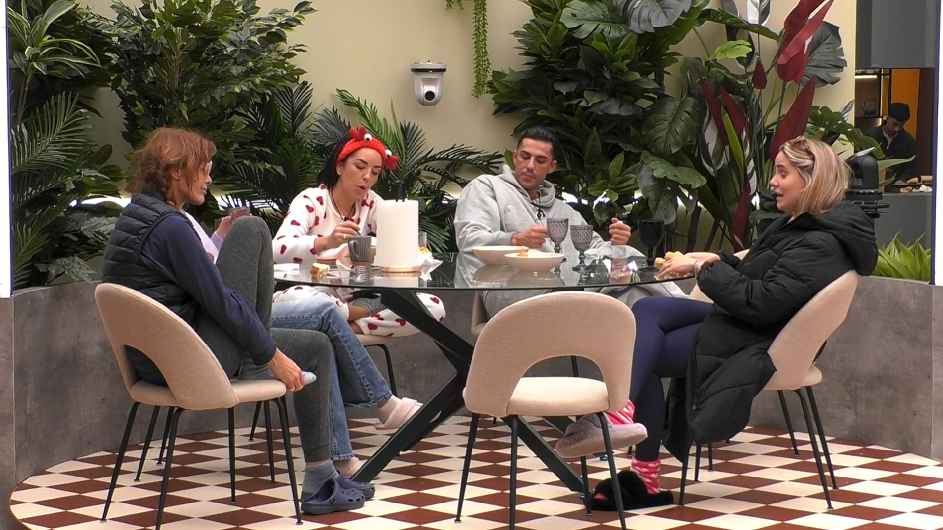 En el sofá redondo tenemos a Mario, Andrea, Gloria y Anita tapados con mantas.