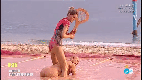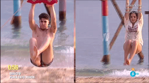 El peluquero, luciendo su espectacular bañador de tirantes, voló en la tirolina hasta el charco junto a Bigote Arrocet y provocó una explosión de barro con su impacto. Ya se lo dijo Jorge Javier cuando iba a saltar del helicóptero, "a ver si vas a vaciar el océano"... y aunque no lo vació, a puntito estuvo de dejar la charca sin barro.