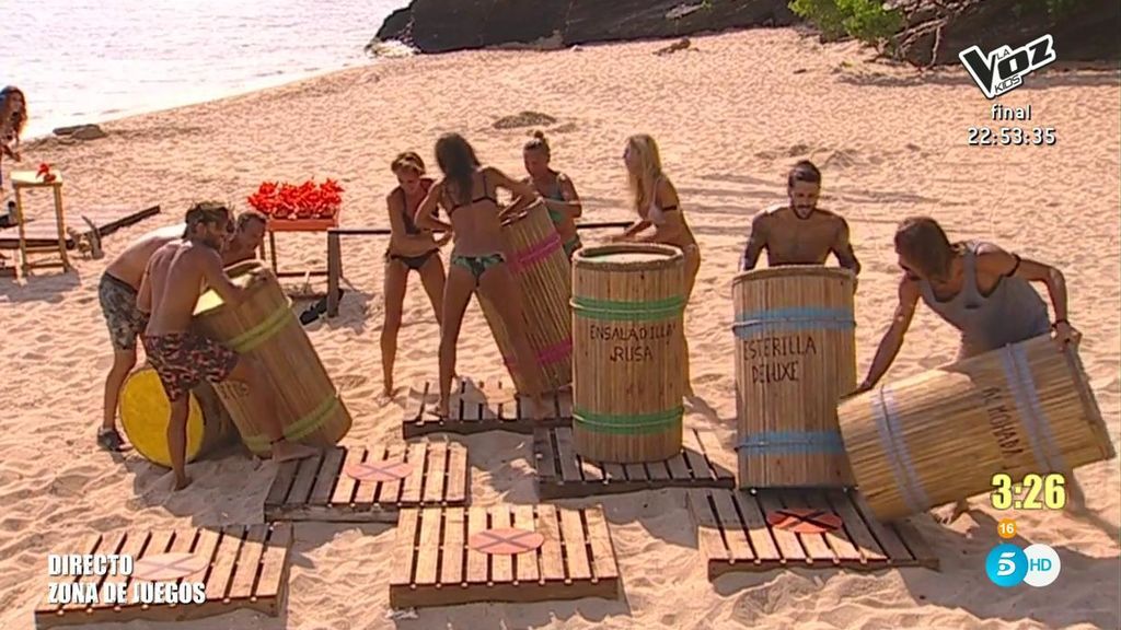 La prueba de recompensa de hoy iba de puntería. Los concursantes tenían que lanzar unos sacos y posarlos encima de unos barriles, cada uno era una recompensa distinta. Ensaladilla rusa, esterilla deluxe, almohadam gominolas... eran sólo algunos de los numerosos premios que han conseguido nuestros supervivientes.