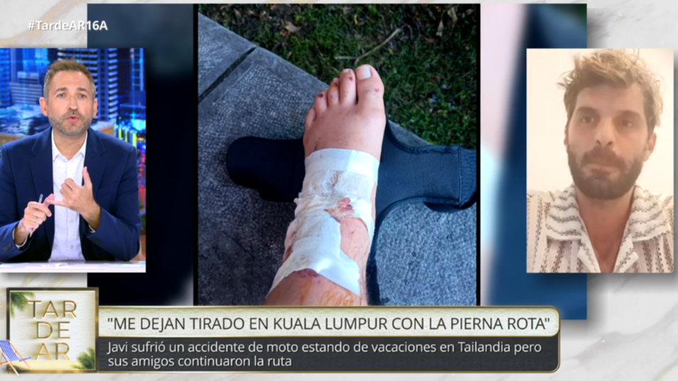 'TardeAR' ha hablado con Javi en exclusiva a través de videollamada. De momento, las gestiones que está haciendo no son muy fructíferas. Cuando tuvo el accidente, acudió al hospital más cercano que había y el seguro que tenía contratado para el viaje le mandó a otro hospital: "Lo único que me hicieron es limpiarme las heridas, ponerme dos gasas y decirme que podía caminar perfectamente. Y que el pie estaba perfecto".